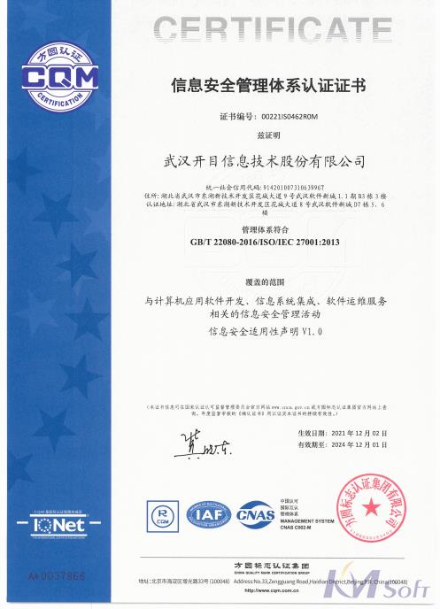 此次開(kāi)目ISO27001體系認(rèn)證資質(zhì)的獲得,標(biāo)志著開(kāi)目公司在信息安全方面的管理體系建設(shè)和實(shí)踐經(jīng)驗(yàn)達(dá)到國(guó)際水平,獲得全球信息安全的權(quán)威認(rèn)可。也證明了開(kāi)目在業(yè)務(wù)運(yùn)轉(zhuǎn)、客戶服務(wù)和法規(guī)要求等方面的信息安全保護(hù)實(shí)現(xiàn)了標(biāo)準(zhǔn)化、規(guī)范化的管理,公司應(yīng)對(duì)信息安全風(fēng)險(xiǎn)的管控能力進(jìn)一步加強(qiáng),能夠給客戶和合作伙伴提供更安全、更可靠的信息技術(shù)服務(wù)。