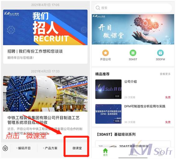 公眾只需在關(guān)注“開目軟件”微信公眾號(hào)后,點(diǎn)擊頁面下方的“微課堂”按鈕,便可登錄平臺(tái)在線學(xué)習(xí)。具體操作步驟如下: