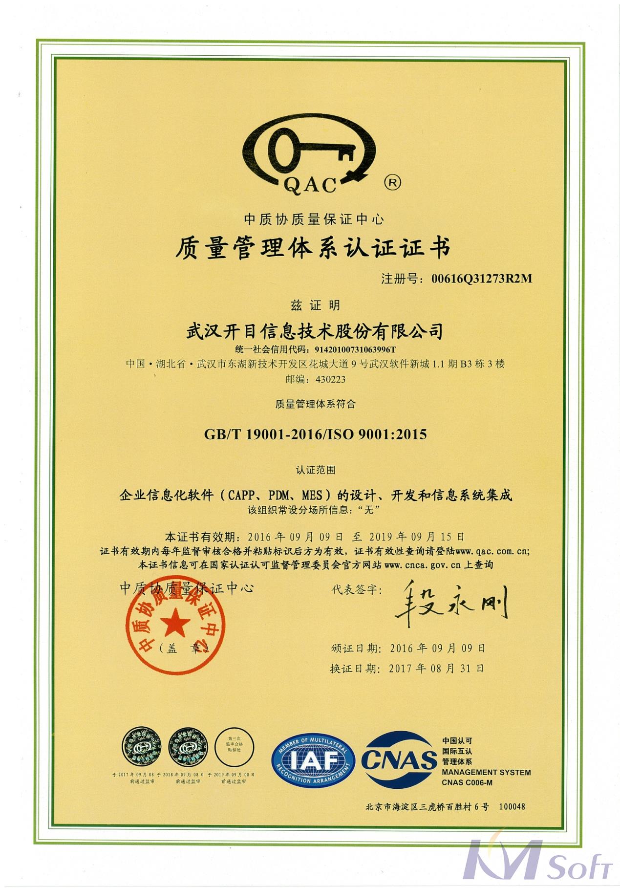 2019年7月29日,武漢開目信息技術(shù)股份有限公司迎來(lái)了2019年ISO9001:2015版質(zhì)量管理體系再認(rèn)證審核,公司總經(jīng)理寧?kù)o波、各部門負(fù)責(zé)人及質(zhì)量部人員參加了審核會(huì)。來(lái)自中質(zhì)協(xié)質(zhì)量保證中心的審核小組,對(duì)開目公司質(zhì)量管理體系涉及到的各個(gè)部門進(jìn)行了現(xiàn)場(chǎng)審核,并通過(guò)聽取匯報(bào)、查閱資料、實(shí)地考察等多種方式對(duì)開目公司的質(zhì)量管理體系運(yùn)行狀況進(jìn)行了全面審核。經(jīng)過(guò)兩天緊張有序的審核工作,審核組認(rèn)為開目公司的質(zhì)量管理體系有效運(yùn)行,符合ISO9001:2015版要求,并一致同意開目公司通過(guò)此次審核。