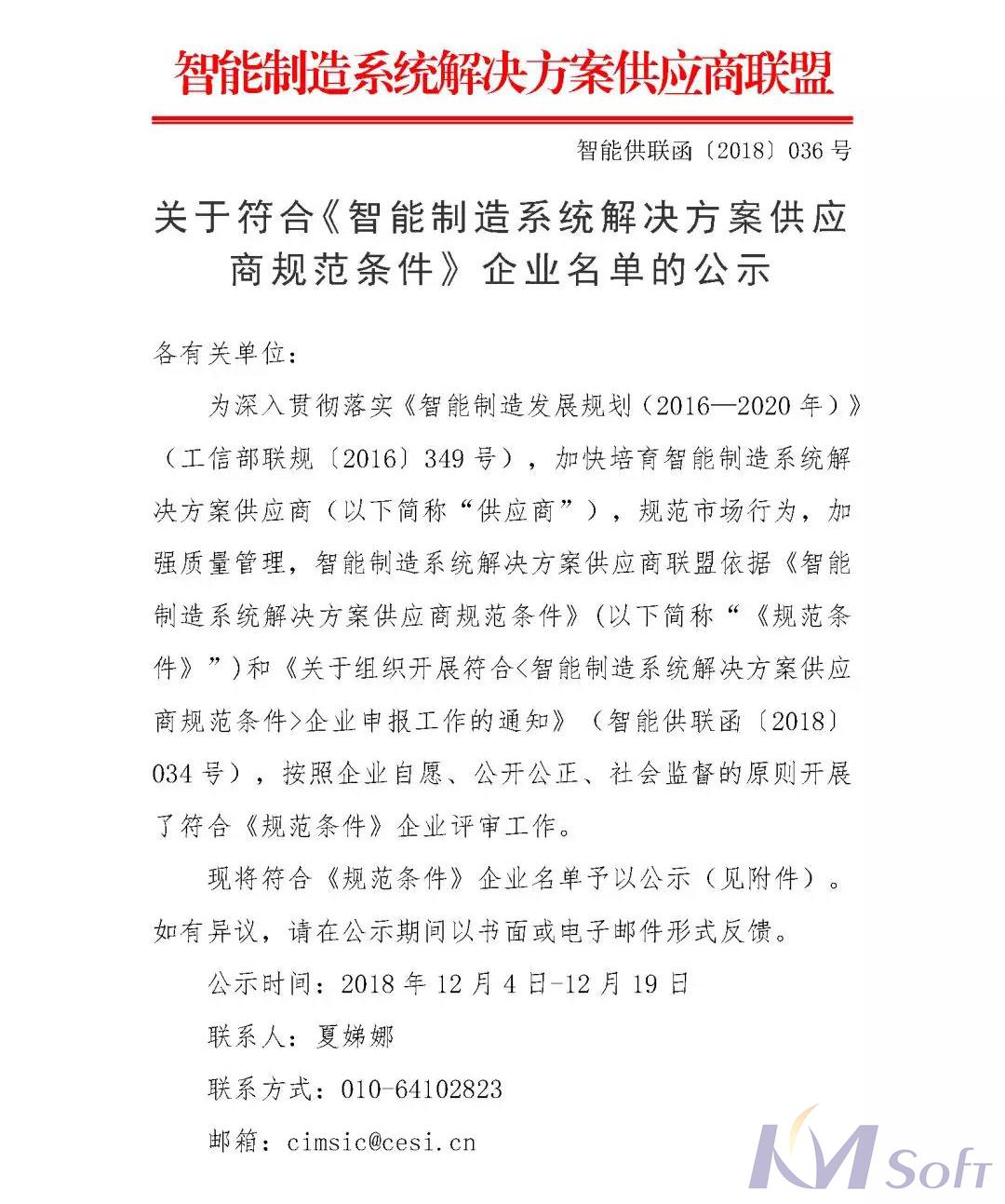 2018年12月4日,由中國智能制造系統(tǒng)解決方案供應商聯(lián)盟組織的“符合《智能制造系統(tǒng)解決方案供應商規(guī)范條件》企業(yè)”評選結果正式出爐,經(jīng)專業(yè)審查,在全國范圍內(nèi)共評審出82家符合《規(guī)范條件》的企業(yè),武漢開目信息技術股份有限公司有幸入選其中。