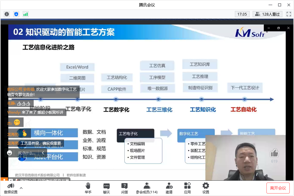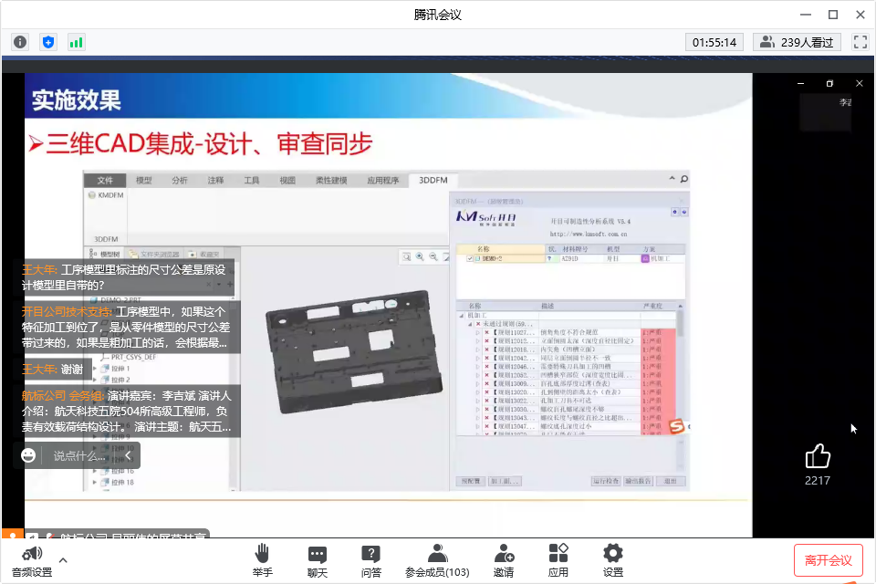 連線研討環(huán)節(jié),參會(huì)代表積極參與,踴躍互動(dòng):工藝的規(guī)劃和審查規(guī)則是基于什么標(biāo)準(zhǔn)制定,是否支持用戶自定義呢?DFM能否審查二維圖紙,二維與三維的尺寸標(biāo)注如何進(jìn)行審查?開目3DAST模型輕量化能對(duì)模型優(yōu)化多少比例,輕量化轉(zhuǎn)換后會(huì)不會(huì)存在模型數(shù)據(jù)丟失或信息缺失?3DMPS中工藝路線如何生成?如何實(shí)現(xiàn)工藝快速變更呢?工藝流程圖如何形成?三維工藝下車間如何實(shí)現(xiàn)?工藝制造一體化如何實(shí)現(xiàn)?······