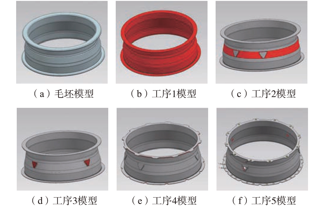 (2)通過(guò)工藝推理獲得特征的加工步驟與余量,然后根據(jù)典型機(jī)匣工藝模板確定機(jī)匣零件工藝路線,自動(dòng)構(gòu)建三維工藝模型,典型機(jī)匣零件加工過(guò)程如圖12 所示。