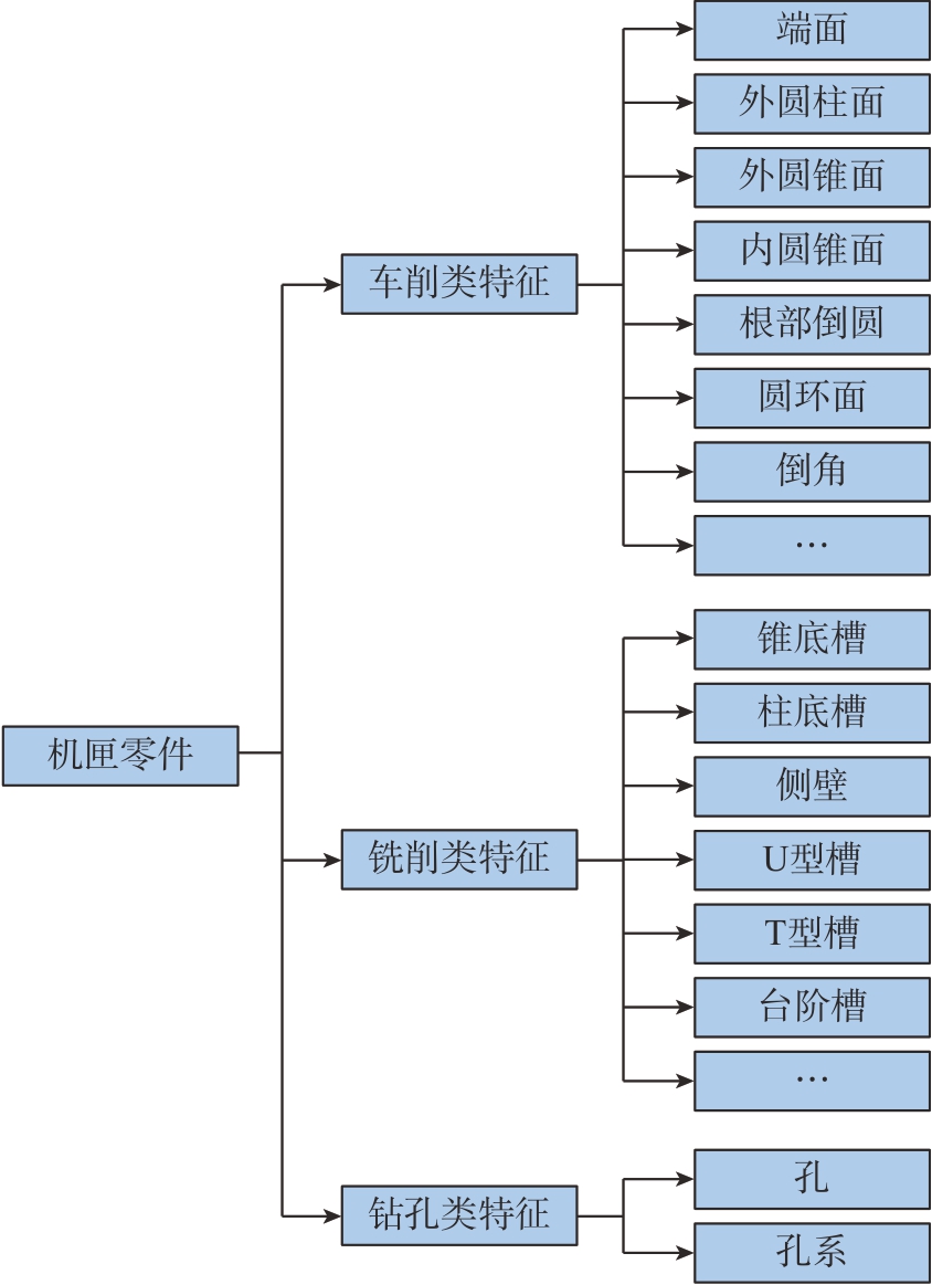 機(jī)匣零件特征主要分為回轉(zhuǎn)面系、錐底槽、側(cè)壁、孔系、平面、環(huán)槽等類型特征,按照加工方法進(jìn)行定義,如圖2 所示。