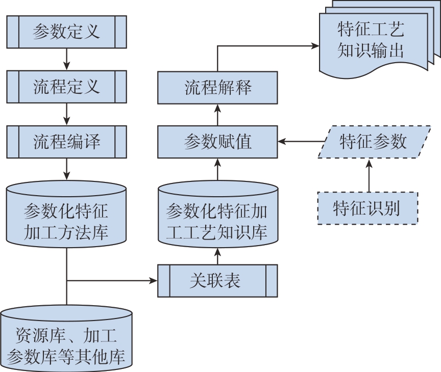 構(gòu)建一個(gè)參數(shù)化工藝設(shè)計(jì)平臺(tái)來(lái)使用工藝知識(shí)庫(kù)中的加工方法推理邏輯流程,通過(guò)采用參數(shù)過(guò)程圖技術(shù)實(shí)現(xiàn)特征工藝知識(shí)的表達(dá)、定義、解釋和輸出。定義參數(shù)過(guò)程圖是工藝知識(shí)表達(dá)和應(yīng)用的核心模塊,其核心功能主要包括參數(shù)定義、流程定義、流程解釋等功能,如圖6 所示。