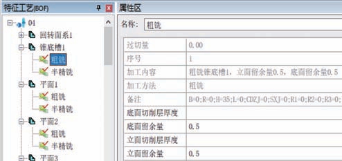 針對(duì)機(jī)匣類型零件,定義一套加工知識(shí)庫(kù),基于識(shí)別的特征的幾何信息與制造信息進(jìn)行加工方法推理,推理出特征的加工步驟以及余量。如機(jī)匣中的錐底槽特征經(jīng)過(guò)知識(shí)庫(kù)的推理得出的加工步驟為“粗銑—半精銑”,且粗銑的底面與立面的余量為0.5 mm,如圖4所示。