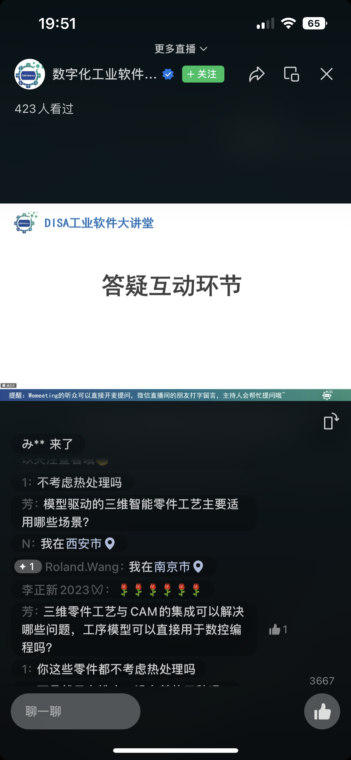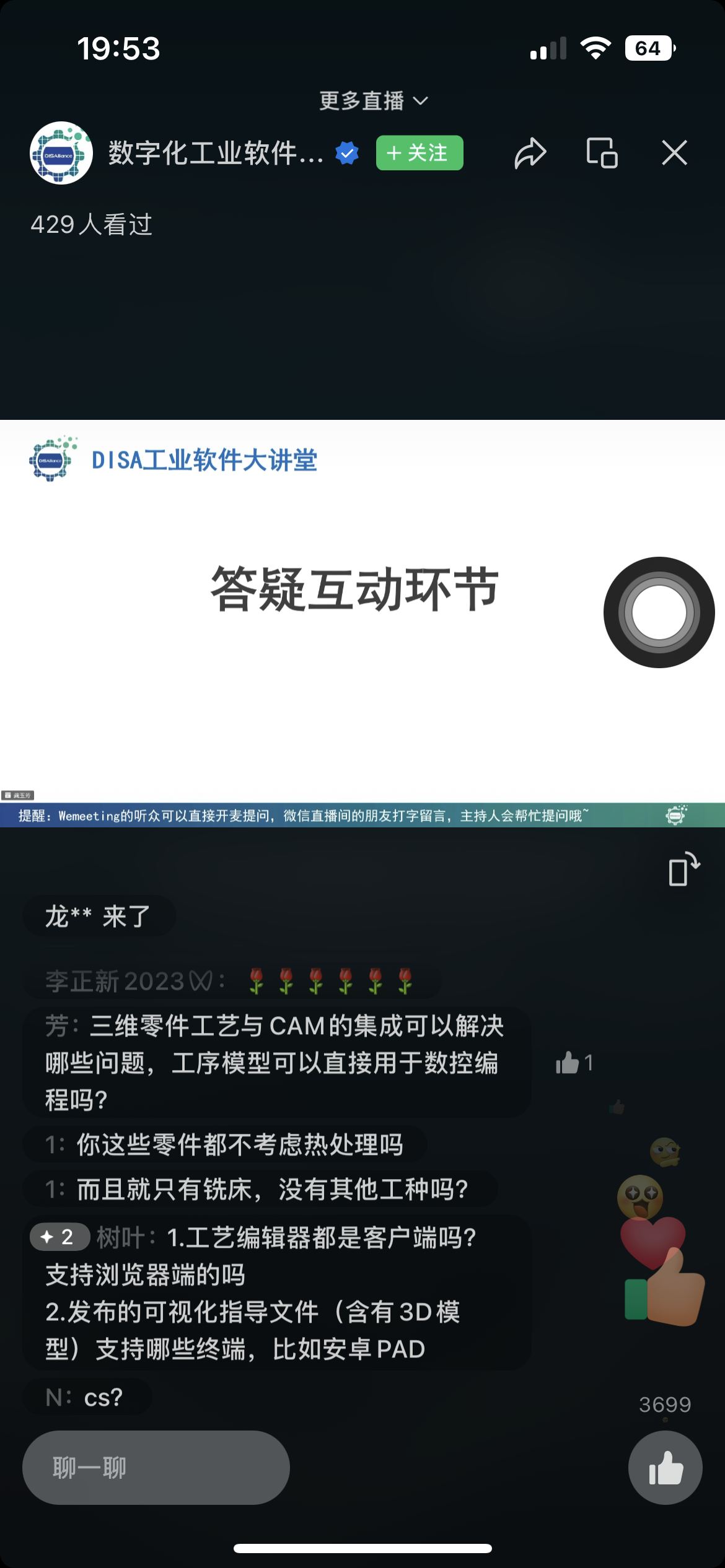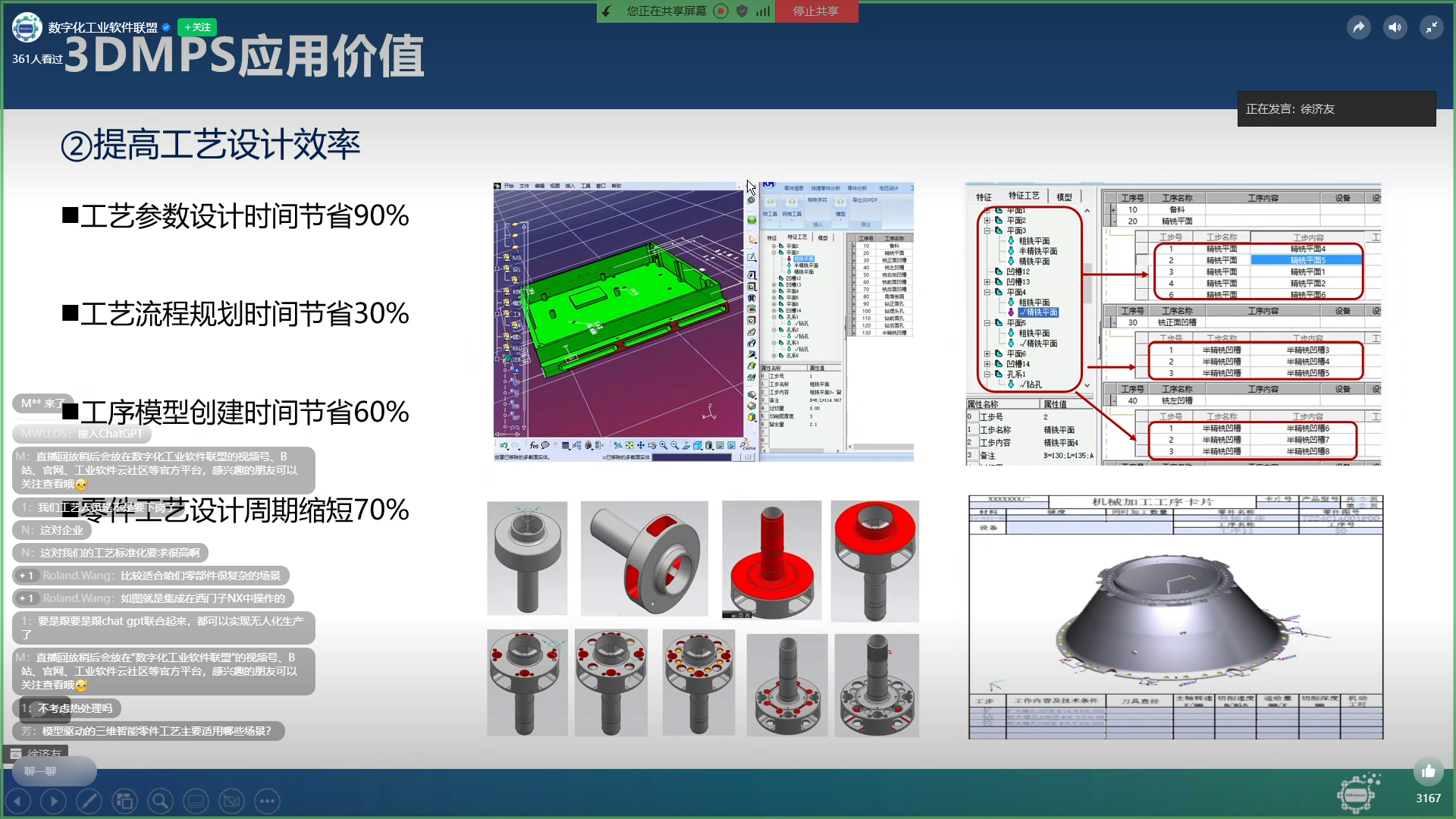 在答疑互動(dòng)環(huán)節(jié),參會(huì)嘉賓踴躍互動(dòng),就模型驅(qū)動(dòng)的三維智能零件工藝適用場(chǎng)景、三維零件工藝與CAM的集成解決方案、3DMPS產(chǎn)品的輸出可支持端口等相關(guān)話題與徐總進(jìn)行深入探討,徐總一一給以專業(yè)、細(xì)致的釋疑解惑,讓線上觀眾更深入了解3DMPS產(chǎn)品價(jià)值和應(yīng)用效果,為制造企業(yè)數(shù)字化工藝創(chuàng)新提供參考借鑒,獲得參會(huì)嘉賓的一致好評(píng)。