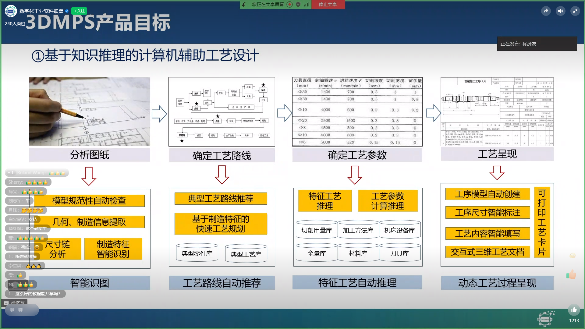 本次直播活動(dòng),由開目3D事業(yè)部總經(jīng)理徐濟(jì)友主講。徐總從制造業(yè)企業(yè)工藝設(shè)計(jì)需求痛點(diǎn)切入,針對(duì)傳統(tǒng)工藝設(shè)計(jì)技術(shù)手段缺乏,三維數(shù)模利用不足、工藝設(shè)計(jì)周期長(zhǎng)等問題,提出模型驅(qū)動(dòng)的智能零件工藝設(shè)計(jì)方案產(chǎn)品3DMPS,從研究目標(biāo)、產(chǎn)品特點(diǎn)、工藝設(shè)計(jì)流程、關(guān)鍵技術(shù)研究等方面進(jìn)行了講解,并重點(diǎn)分享了開目3DMPS在汽車發(fā)動(dòng)機(jī)缸體零件、某航天零件、某葉輪零件等應(yīng)用實(shí)踐,引起了在線觀眾的熱烈反響,紛紛表示受益匪淺。