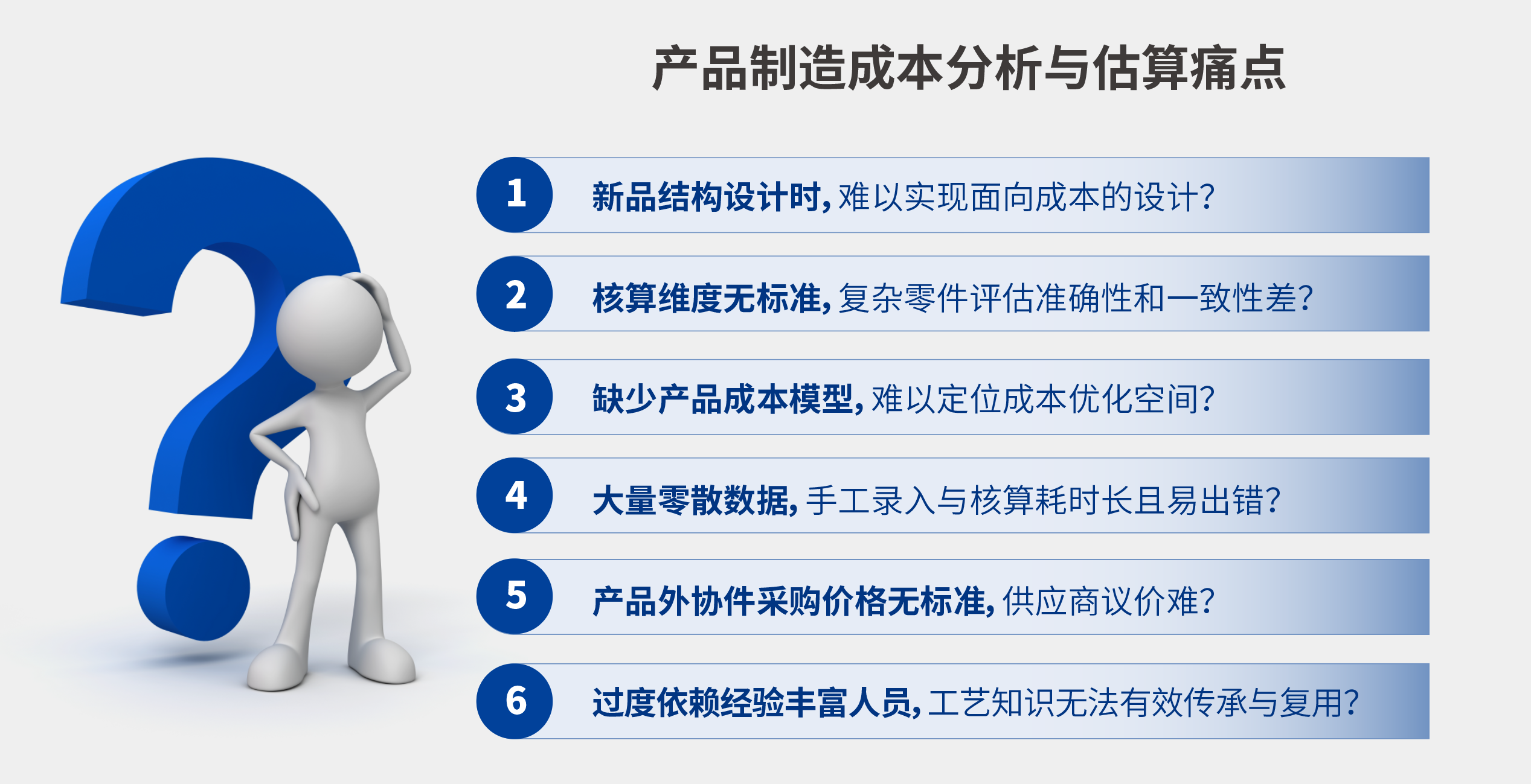 隨著科技的不斷進(jìn)步和全球化市場(chǎng)的發(fā)展,推進(jìn)數(shù)字化轉(zhuǎn)型、服務(wù)產(chǎn)品升級(jí)、提高經(jīng)營(yíng)效率、降低生產(chǎn)成本成為裝備制造企業(yè)贏得競(jìng)爭(zhēng)的關(guān)鍵。而產(chǎn)品的成本貫穿整個(gè)產(chǎn)品生命周期,研究表明,70%-80%的成本在研發(fā)階段就已經(jīng)確定,因此裝備制造企業(yè)普遍尋求應(yīng)用數(shù)字化手段來(lái)降低產(chǎn)品成本,從而提高產(chǎn)品的競(jìng)爭(zhēng)力。但企業(yè)在產(chǎn)品的成本控制和降本方法上,常常會(huì)面臨以下問(wèn)題: