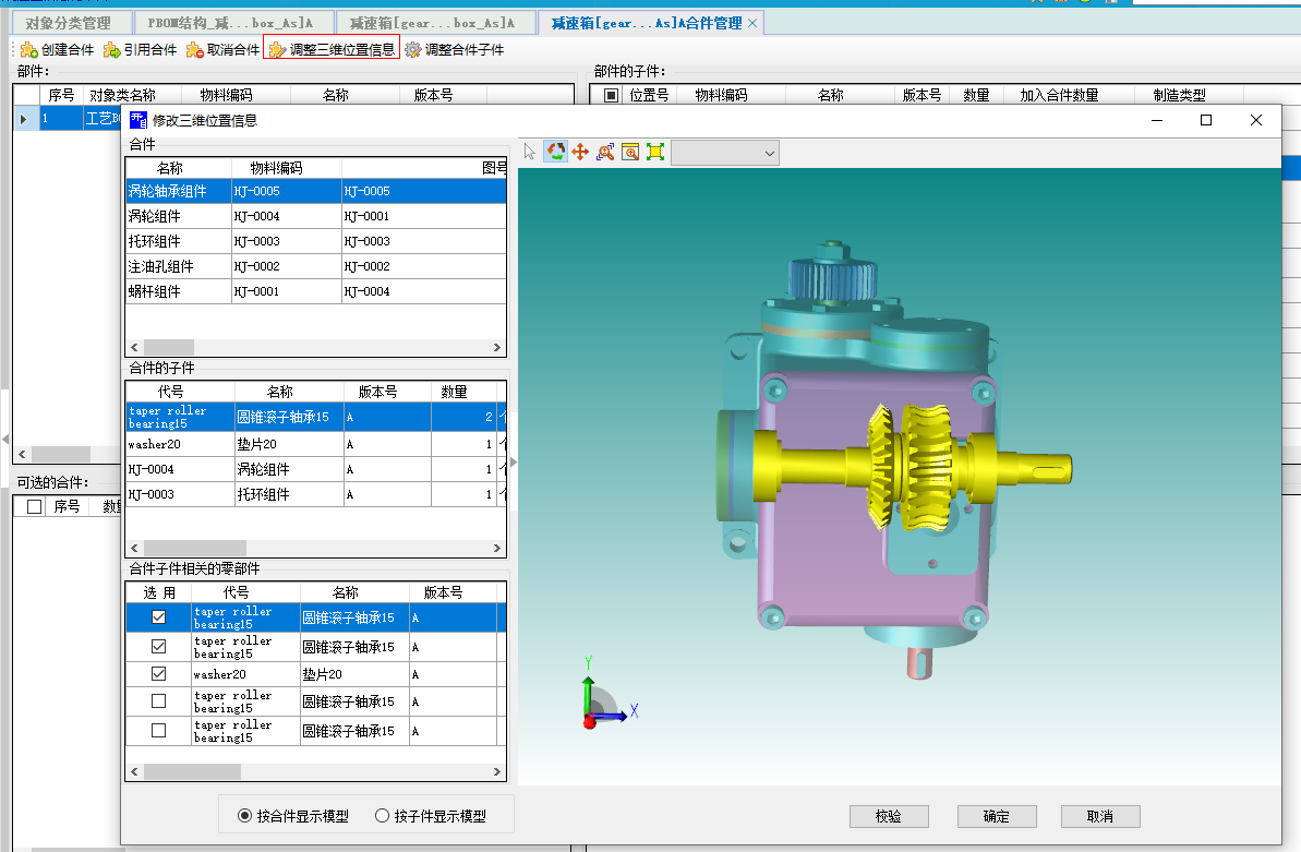 合件的維護是PBOM調(diào)整的重要工作之一,開目eCOL PLM通過引用合件的三維模型以及合件的變更,可保障PBOM中結(jié)構(gòu)的完整性和一致性。新版本PLM能夠輔助企業(yè)規(guī)范合件庫的管理,實現(xiàn)合件庫的有效應(yīng)用,并且提供批量的合件操作功能,如部件批量自動檢索、合件引用、合件變更等,大幅提供工作效率。同時也支持部件下合件的三維模型設(shè)計,基于此模型來調(diào)整合件中具體的零件實例,以此支持基于具體位置的零件的合件生成,以及滿足左右件等合件生成的要求。