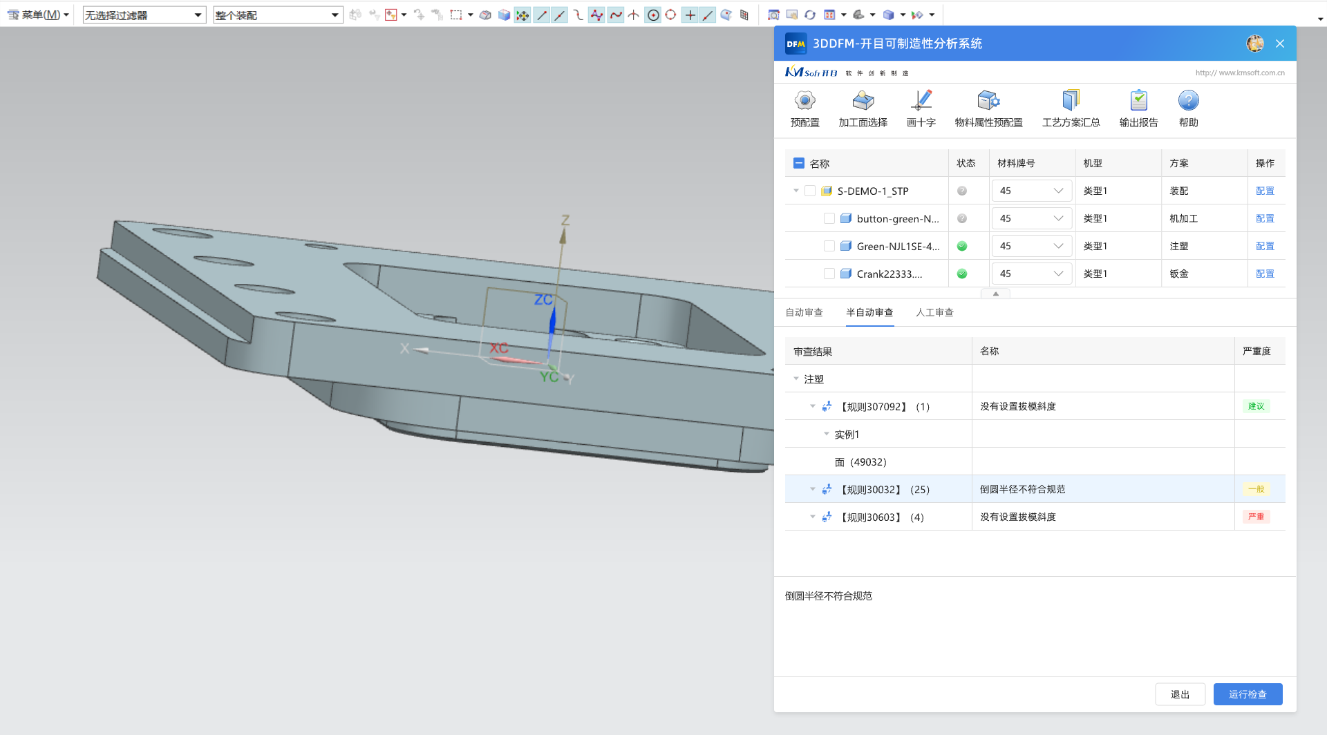 開目3DDFM兼容主流三維CAD,可根據(jù)規(guī)則對產(chǎn)品設(shè)計模型進(jìn)行檢查和分析,幫助設(shè)計人員、工藝人員、制造工程師盡早發(fā)現(xiàn)設(shè)計中難以制造、無法制造或制造成本高的設(shè)計缺陷,減少工藝性評審時間以及設(shè)計與工藝往返次數(shù),縮短產(chǎn)品開發(fā)周期。