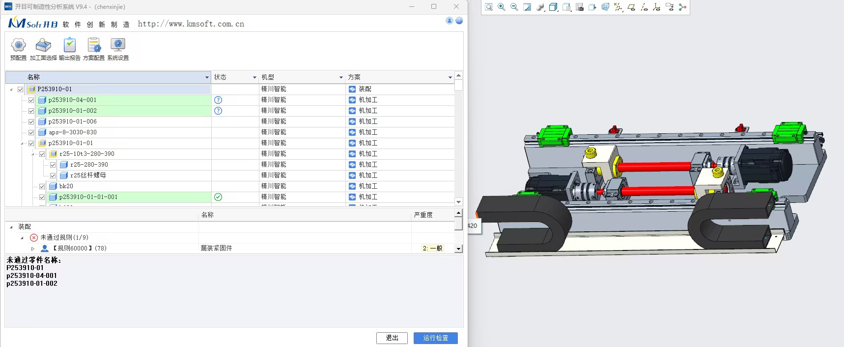 開目3DDFM基于企業(yè)實際工藝能力與生產(chǎn)場景,對100余條可制造性審查規(guī)則進行參數(shù)適配與優(yōu)化,形成貼合企業(yè)需求的 “可制造性知識庫”,在設(shè)計師完成數(shù)模設(shè)計后自動觸發(fā)工藝性審查流程,實時識別設(shè)計中存在的制造難、無法制造或成本高的潛在問題,并直觀提示問題位置、違規(guī)原因及優(yōu)化建議。
